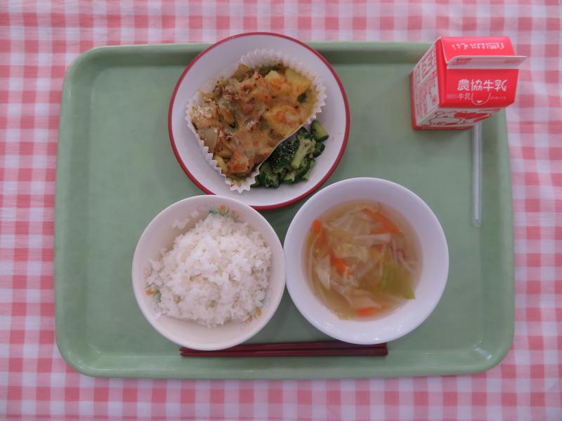 今日はじゃがいも・たまねぎ・ピーマン・豚ひき肉・エリンギをカレー風味で味付けをし、カップに入れてチーズをかけて焼きました。グラタンのようで、子どもたちも大喜びでした!