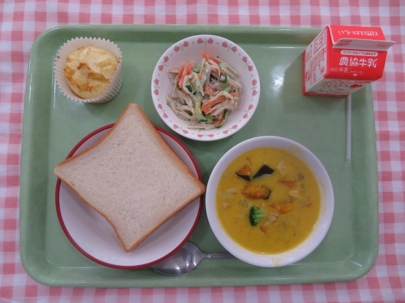 ピザトースト マカロニサラダ パンプキンシチュー 牛乳