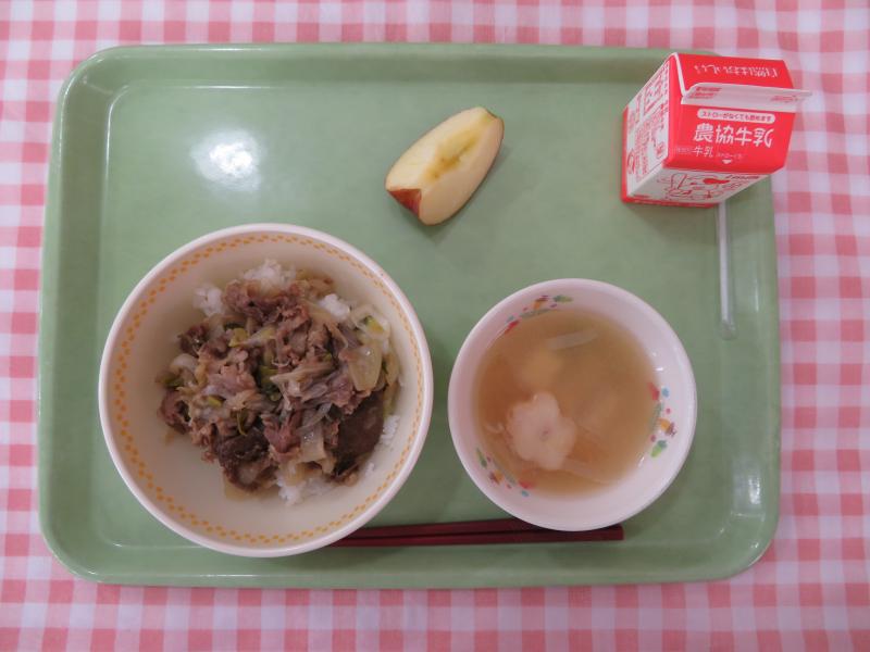 11月29日の「いい 肉の日」の語呂に合わせて、能登町産食材を使った「能登牛牛丼」をいただきました。 能登町のおいしい特産品を町の未来を担う子どもたちに味わってほしいという思いから、能登牛と能登牛の堆肥を使用した特別栽培米「能登姫」、町内農家で生産されたたまねぎを提供していたただきました。