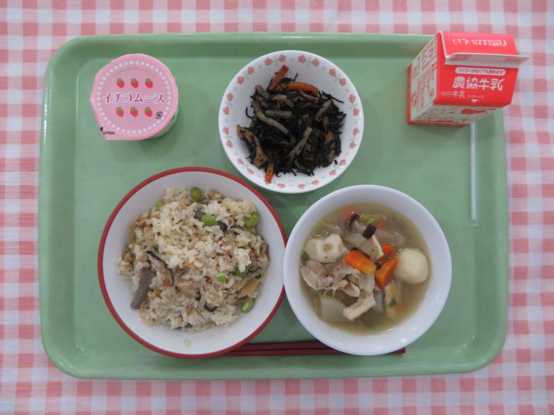 また、福岡県では「あまおう」というブランドのいちごが有名です。あまおうとは、「あかい・まるい・おおきい・うまい」の頭文字から、名づけられました。給食(きゅうしょく)では、いちごのムースをデザートにしました。