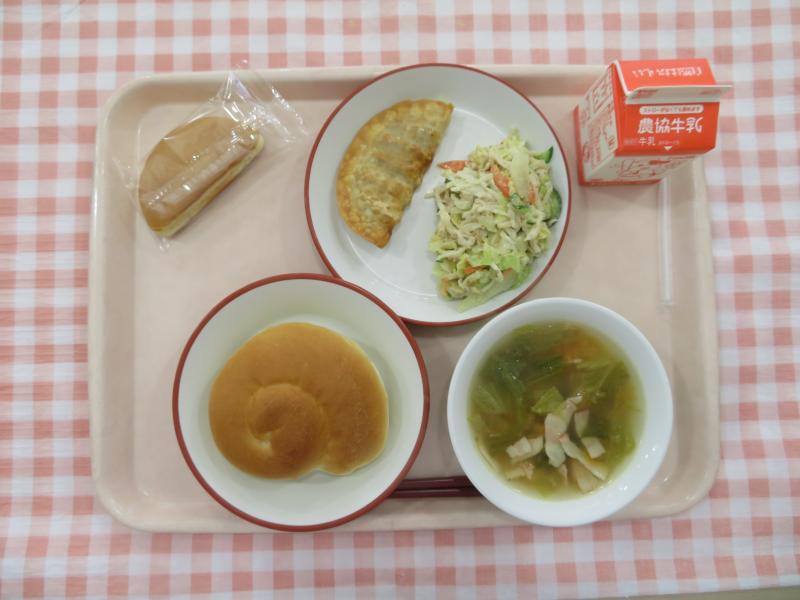 今日は、大きなぎょうざのような形の「パリツォーネ」を出しました。中にはミートソースが入っていてイタリアの揚げぎょうざのような料理です。子どもたちは、初めて聞くパリツォーネという料理にいろいろと想像を膨らませていたようです!デザートのクリームコンフェも同じような三日月型をしていて、喜んでいました。