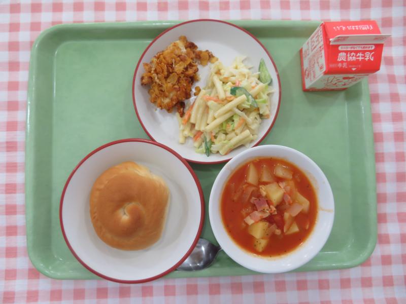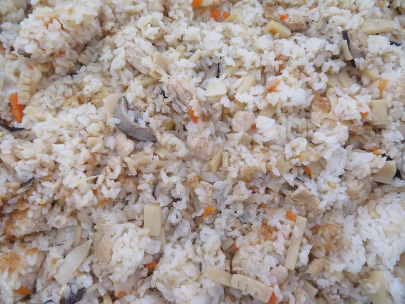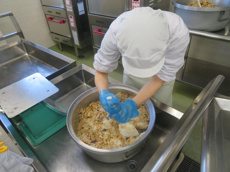 今が旬のたけのこは、表年(豊作)と裏年(不作)がありますが、今年は表年といわれています。給食では、子どもたちも食べやすいように鶏肉や油揚げも入れた具材たっぷりの五目たけのこごはんにしました。