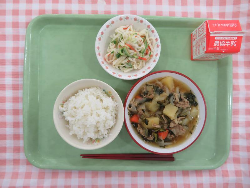 初日は北海道給食です。鶏ザンギの「ザンギ」とは食材に下味をつけ、粉をまぶして揚げたりょうりのことを言います。から揚げとよく似た料理です。北海道のお店で生まれた料理で、味を染み込ませた濃い目の味が特徴です。どさんこ汁の「どさんこ」とは、北海道で生まれた人やものを意味します。「いつもの唐揚げと少し違うけどおいしい!」や「鶏ザンギがごはんに合っておいしかったです。」と言ってくれる児童が多く、から揚げが好きなやなぎっ子たちにも喜んでもらえてよかったです。