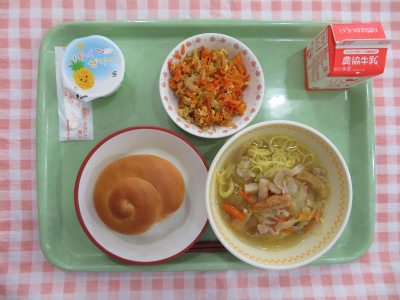 ソーキそばの「ソーキ」とは骨付き肉のことで、甘辛く煮て味付けします。給食では豚もも肉を釜でじっくり煮込みました。そばといっても、麺は小麦粉で作られ、太さも見た目もうどんや中華麺に似ています。にんじんしりしりは、沖縄県の代表的な家庭料理です。「しりしり」は、にんじんをすりおろす時の動作や音である「すりすり」を表す沖縄の方言が由来とも言われています。かんたんに作れて栄養満点なので、子どもから大人まで人気の沖縄料理です。また、沖縄県はパイナップルの収穫量が全国1位なので、デザートにパイナップルゼリーをつけました。