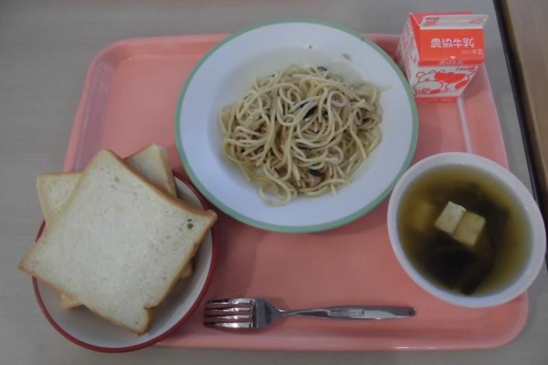 食パン ツナの和風スパゲッティ わかめスープ 牛乳