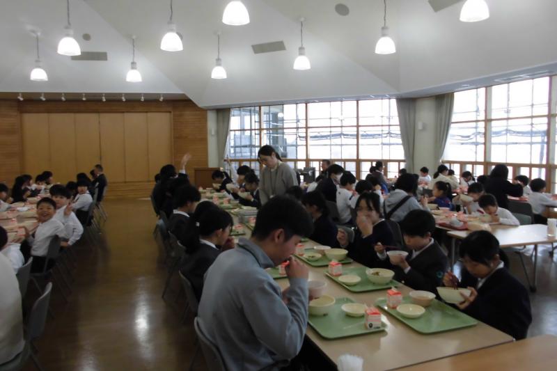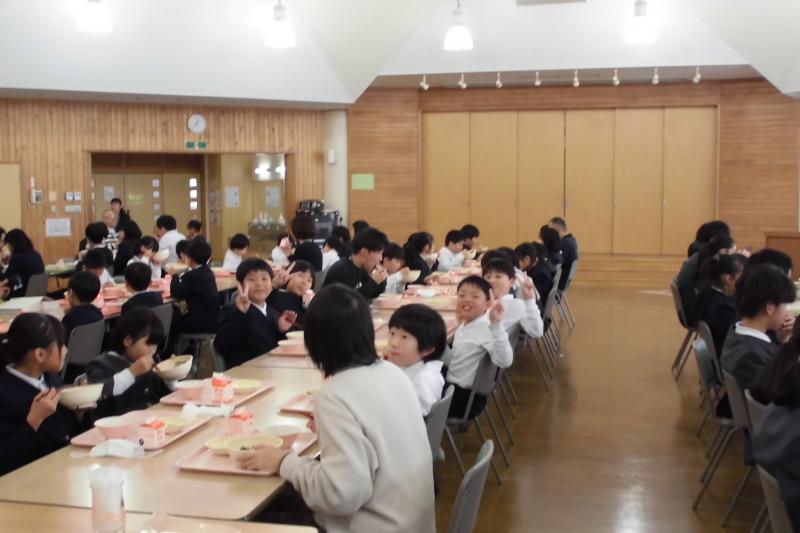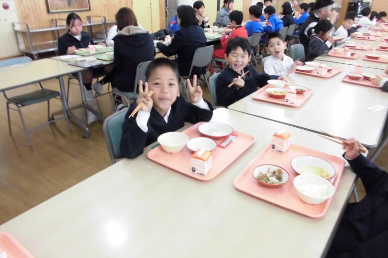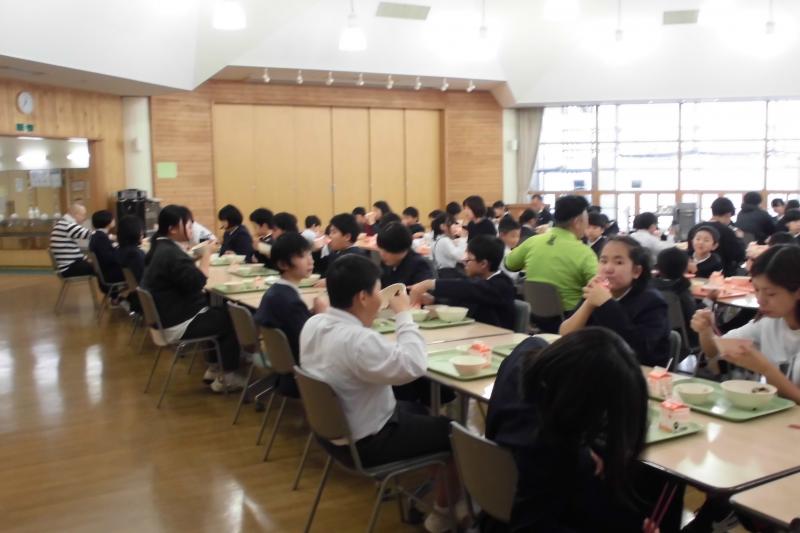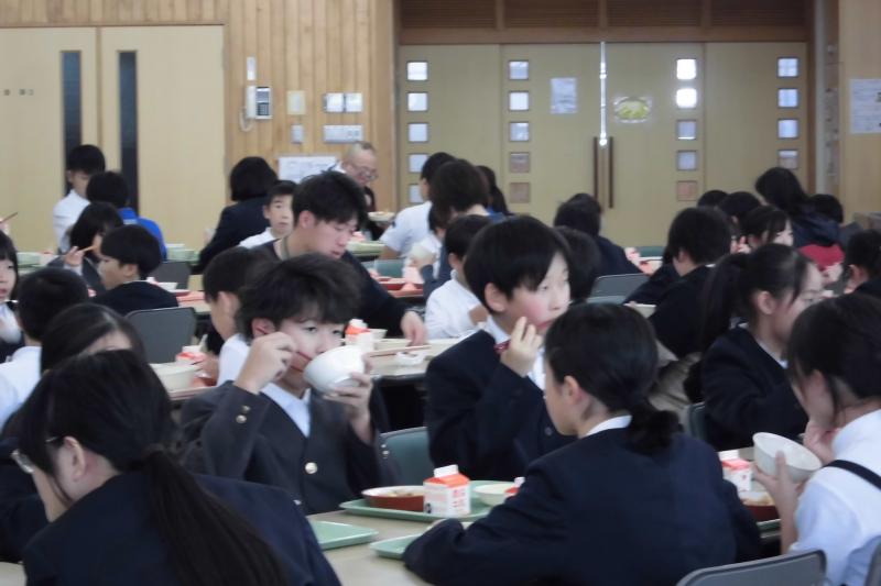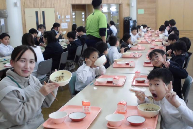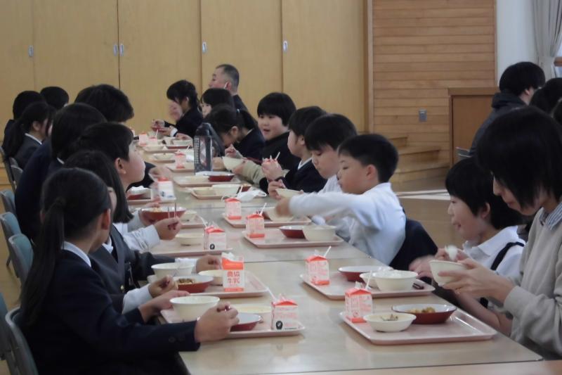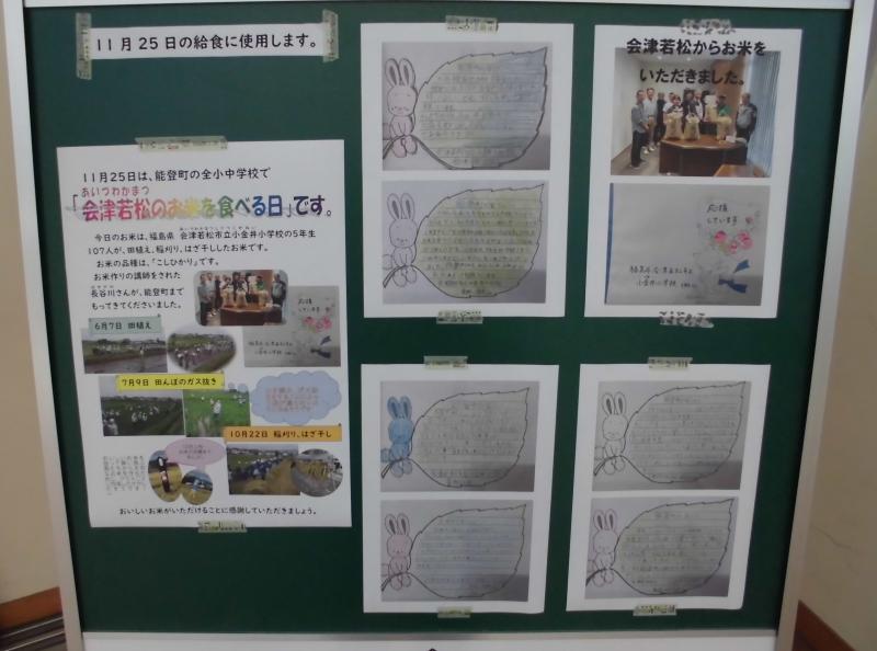 今日は能登町の全小中学校で福島県会津若松市立小金井小学校の5年生が、田植え、稲刈り、はざ干ししたお米を食べる日でした。