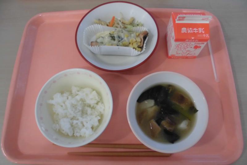 ごはん さけのマヨネーズ蒸し ごま酢和え みそ汁 牛乳