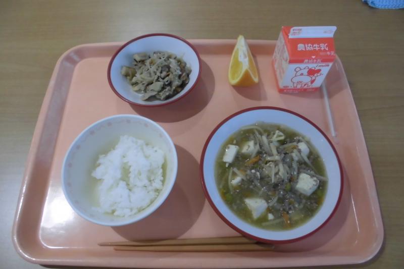 ごはん れんこんのきんぴら 豆腐とひき肉のうま煮 いよかん 牛乳