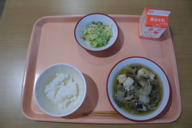 ごはん ふりかけ チキンナゲット れんこんサラダ 肉団子スープ 牛乳