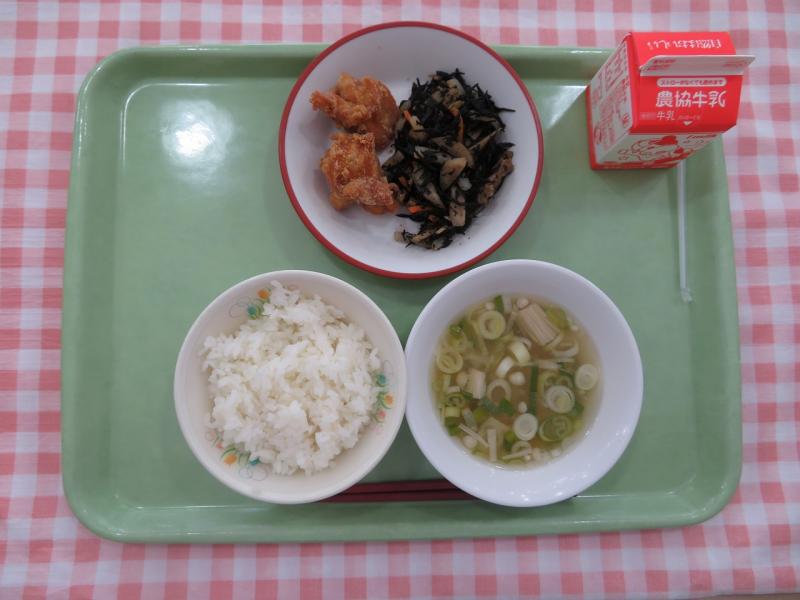 今日は、子どもたちの大好きな鶏のから揚げでした。給食のから揚げは、米粉を使用しています。さくさくに仕上がります!
