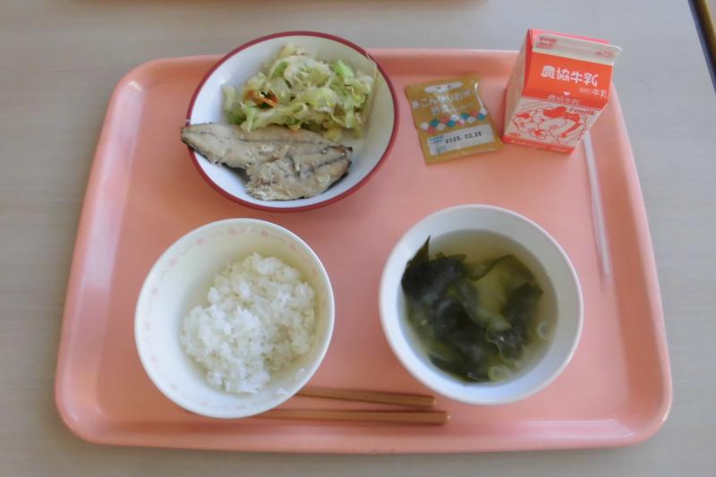 ごはん 焼きサバ キャベツのおひたし みそ汁 ふりかけ 牛乳