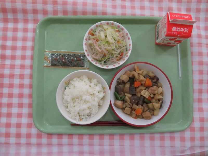 今日は和食の献立です。いりどりは、鶏肉・ごぼう・れんこん・にんじん・こんにゃく・ちくわ・たけのこ・じゃがいも・しいたけ・いんげん・高野豆腐とたくさんの食材を入れました。味がしみ込んでいておいしかったです。寒くなってきたので、煮物がおいしい季節になりました。