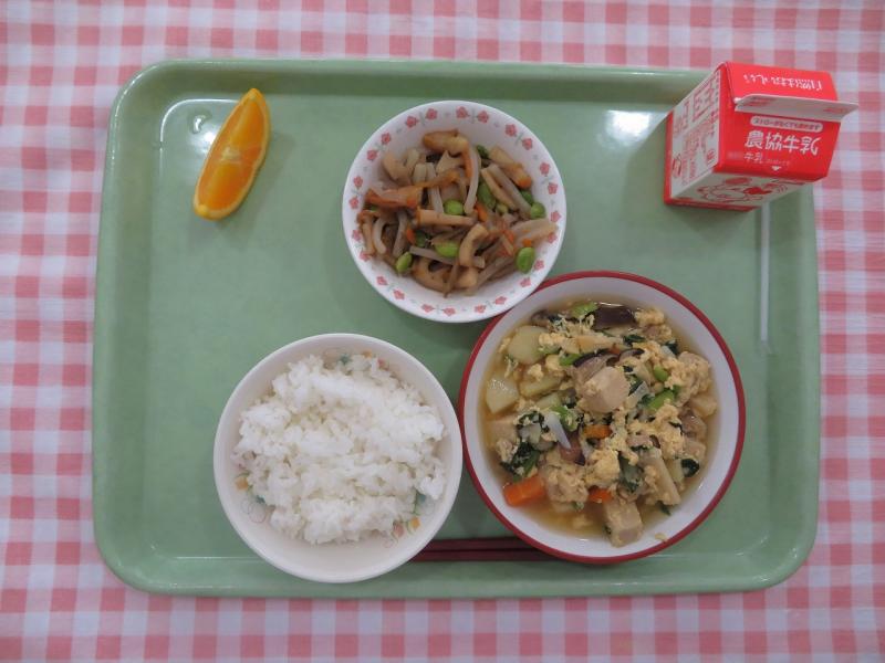 たまごとじはじゃがいも・にんじん・たけのこ・こまつな・高野豆腐などたくさんの食材を使用します。優しい味付けでおいしかったです。