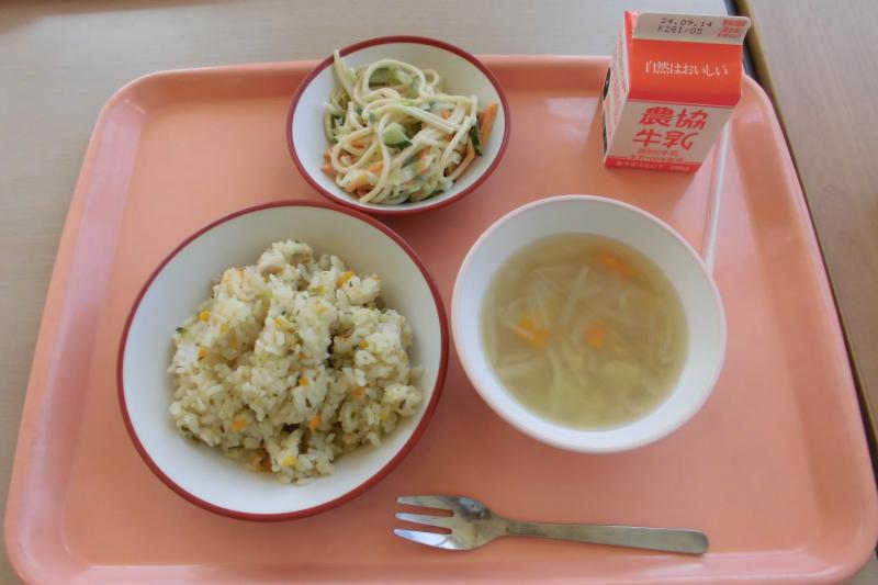 ミックスピラフ スパゲッティサラダ コーンスープ 牛乳