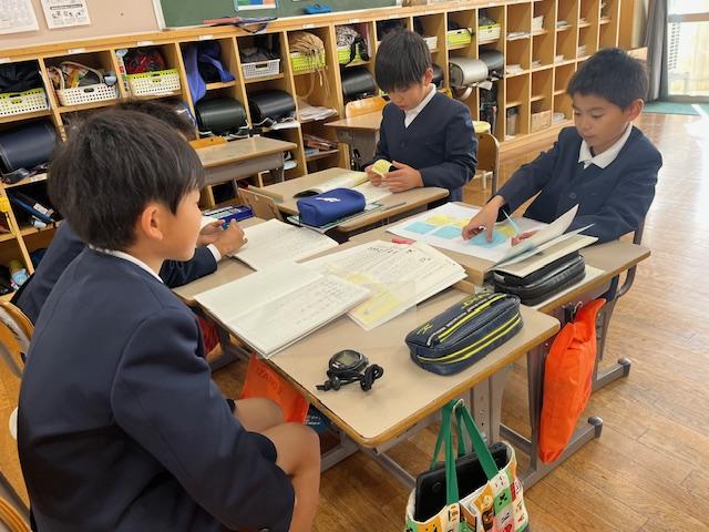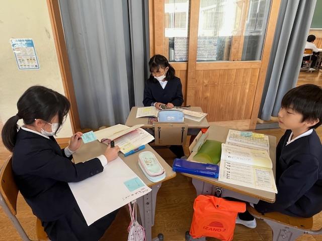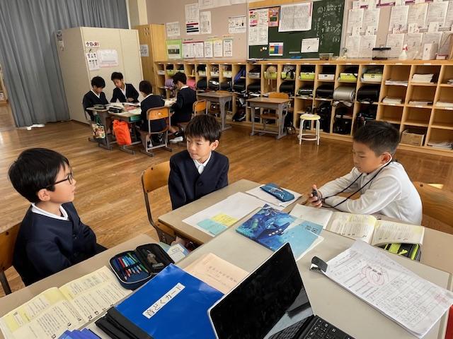 3年生の国語の時間。グループに分かれ、ストップウォッチを片手に話し合いを行っていました。