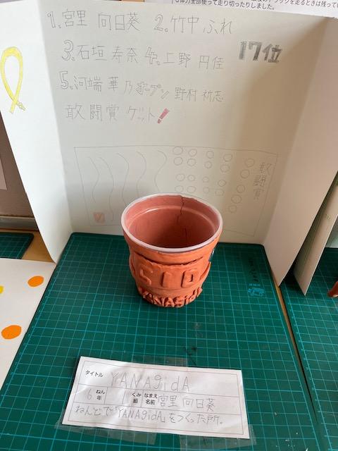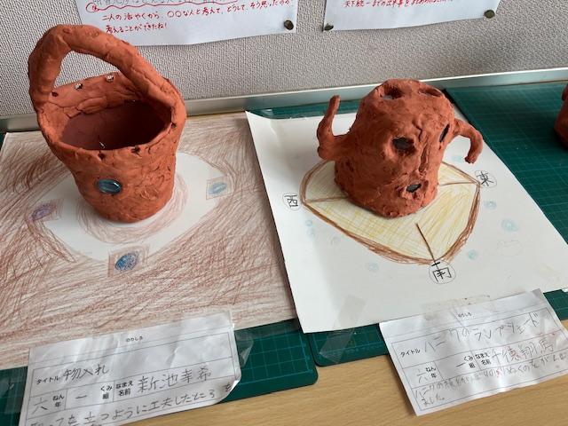 粘土でコップを作っていました。それぞれが工夫したところをしっかり書いてあります。なるほど、なるほど・・。製作者の気持ちが伝わってきますね。作品のバックなどに描かれている絵もまた素敵です!