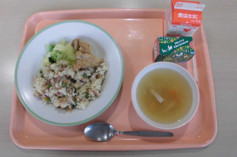 五目チャーハン 鶏肉のから揚げ ゆで野菜 コンソメスープ クリスマスケーキ 牛乳