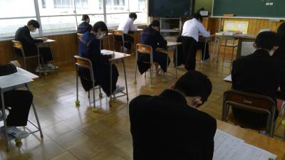 2月6日、3年生が中学校生活最後の定期考査に臨みました。この日は国語・理科・英語のテストがあり、みんな時間いっぱい真剣に取り組んでいました。明日は社会と数学があります。このテストが終われば、公立高校入試まであと1か月です。