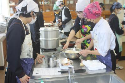2月6日、1年生が調理実習に挑戦しました。調理したのは、蒸しパンとホットケーキです。4人程度のグループになって卵を割ったり、粉を加えたり、フライパンや蒸し器を使ったりと手際よく?作業を進めました。最後にフルーツも盛り合わせ、見た目もきれいな「作品」が仕上がりました。試食の時間は、みんなとても楽しそうでした。