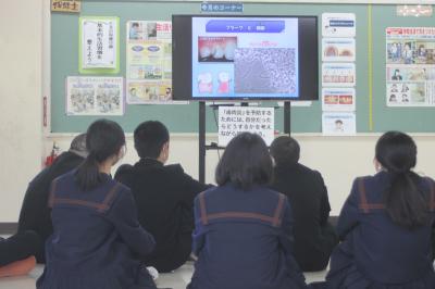 5月24日、3年生による高校調べの発表会がありました。校訓や部活動など各自が詳しく調べた内容をスライドにまとめ、分かりやすい発表にしあげていました。2年生全員がこの発表会に参加し、進路への意識を高めていました。