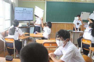 9月16日、保健委員会による「睡眠クイズ」がおこなわれました。①「夜寝ている間にどのくらいの量の汗がでるのか?」②「寝る子は育つ、ということわざは本当か?」といった質問に答えながら学習を深めました。ところで上記①②の答えは何でしょう。答えは写真の下にあります。チェックしてみてください。