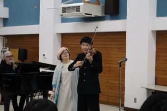 ニュージーランド出身で音楽家のスティーブン スモールさん、宮城県松島市出身でヴァイオリニストの鹿嶋 静さんと三重支援チーム楽笑代表あの岩城ひろこさんによる演奏会と楽器体験、お話会がありました。