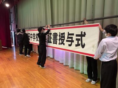 3月9日、在校生が卒業式の準備をしました。手分けして式場を設営したりお祝いメッセージを掲示したりなど、心を込めて作業しました。 10日には、卒業式の予行が行われます。3年生の旅立ちの日は目の前に迫ってきました。