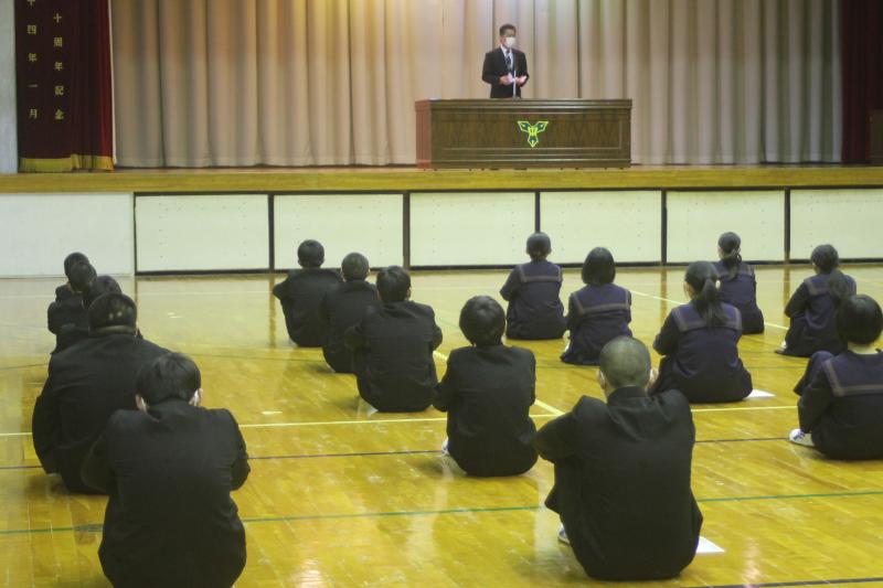 3月24日、3学期終業式ならびに本年度の修了式がおこなわれました。学校長は式辞の中で、自分を肯定的に評価する生徒の割合が低下傾向にあるという本校生徒アンケートの結果に触れ、周りに合わせるのではなく、自分に自信を持って行動してほしいとの励ましの言葉を贈りました。
