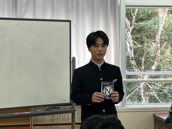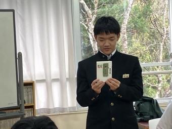 生徒会文化委員会が企画して、ビブリオバトルを開催しました。今回は先生1名と生徒3名が自分が面白いと思う本を持ち寄り、プレゼンテーションを行いました。発表後、「最も読みたくなった本」を投票で決定しました。
