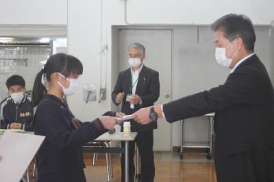 1月14日、給食後の時間を使って書き初め大会の表彰式がおこなわれました。各学年金賞受賞者が代表として、学校長から表彰状を受け取りました。書き初め大会の担当教員からは、黙々と書き初めに取り組んだ全校生徒の姿勢を称賛する講評がありました。