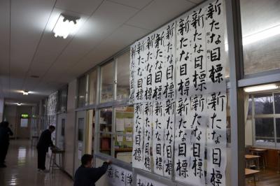 1月11日、恒例の書き初め大会が開かれました。生徒たちは真剣な表情で取り組んでいました。作品は教室前廊下に展示されています。