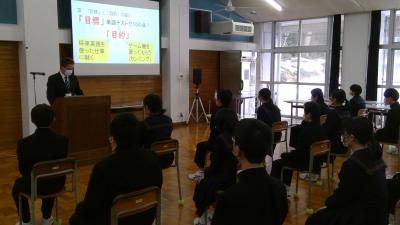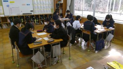 1月10日、読書の時間に文化委員会の主催で冬休みに読んだ本の交流をしました。各学級で数人の班になり、読んだ本の内容や感想を伝え合いました。部活動が冬季時間となっており、時間に余裕があります。読書の機会を積極的に設けて、視野を広げたり考えを深めたりしてほしいと思います。