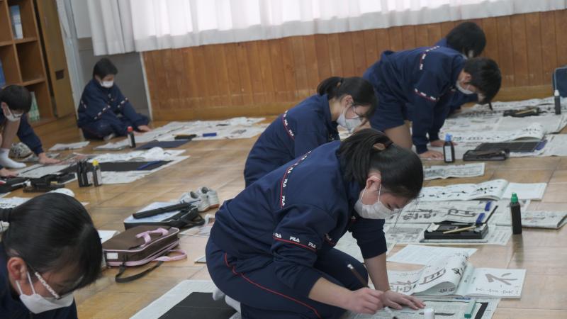 1月10日、恒例の書き初め大会がおこなわれました。1年生は「不言実行」、2年生は「新たな目標」、3年生は「無限の可能性」が課題で、いずれも行書に挑戦しました。冬休みの宿題でもこの課題に取り組んできており、さらに良い作品作りを目指して、どのクラスでも真剣に自分の書と向き合っていました。