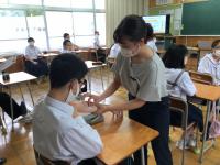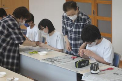 7月13日、2年生が小間生公民館で久田和紙を使ったうちわづくりに挑戦しました。指導は久田和紙を伝承している「みわ会」の皆さんです。生徒は細かい作業に神経を集中させ、一心に取り組んでいました。昨年度経験した紙漉き体験とはまた違った楽しさを感じながらの作業でした。終了後は、栞づくりの指導もしていただきました。