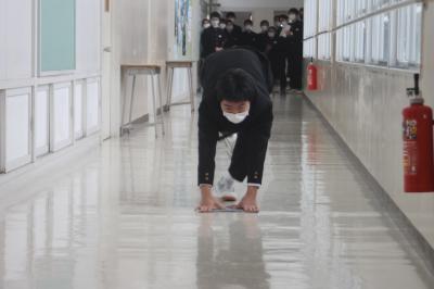 2月25日のお昼、生徒会美化委員会主催の「柳中雑巾がけ大会」が3階廊下で開催されました。やり方は、雑巾がけで廊下を往復するというものですが、厳正な(?)採点基準があります。それは ①スピード ②きれいになったかどうか ③芸術性 以上の3点です。総合点で上位の生徒が表彰されました。コロナ禍で、ややもすれば沈みがちになりますが、おかげで和やかな雰囲気で楽しい時間を過ごすことができました。