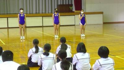6月24日、県大会に出場する陸上部員の激励会がおこなわれました。生徒代表や学校長から激励の言葉があり、続いて全校生徒で応援の気持ちを込めて三三七拍子を贈りました。本校からは3人の女子部員が100m、100mH、走幅跳、砲丸投の4種目に出場します。ベストのパフォーマンスができるよう、期待しています。