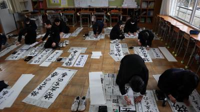1月9日に予定していた書き初め大会を約1か月遅れで1年生が行いました。うまく書けたかな?