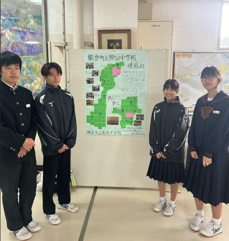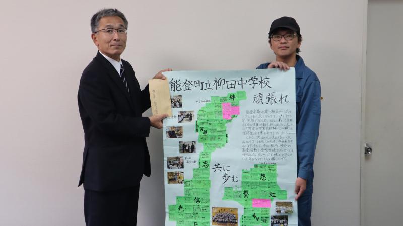 一般社団法人Canp 平川さんが学校を訪問されて、福岡県朝倉市立杷木中学校の生徒の皆さんからの心温まる応援メッセージと生徒会を中心に募金活動をされて集まった義援金を届けてくれました。心より感謝申しあげます。