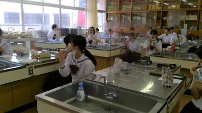 6月16日(木)5限2年生、6限1年生に小下美子歯科衛生士をゲストティーチャーとしてお招きし、歯みがき教室が行われました。歯垢染め出し液で歯垢を染め出し、その後丁寧にブラッシングしました。歯を「みがいたつもり」でも「みがけていない」ことがわかったことでしょう。これからの歯みがきをしっかりして欲しいと思います。