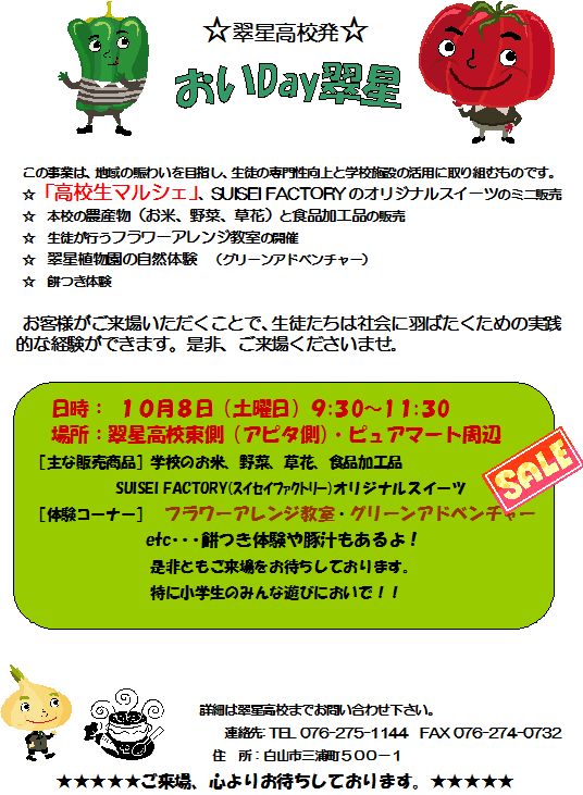 翠星高校では10月8日(土)に『未来の職業人プロジェクト』の一環として「おいDay翠星」を生徒主体で開催します。お客さんとの対応の中で生徒の実践的な力を伸ばすのが目的です。多くの方の来場をお待ちしています。